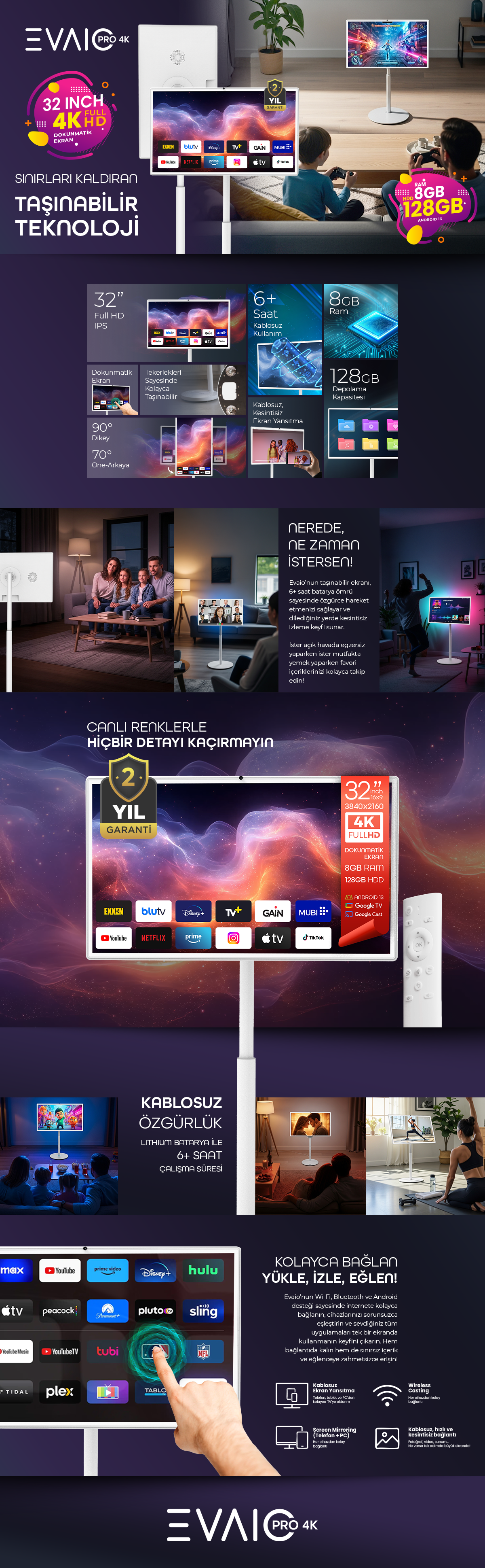 EVAİO Pro 4K 32″ Android Smart Taşınabilir LED TV