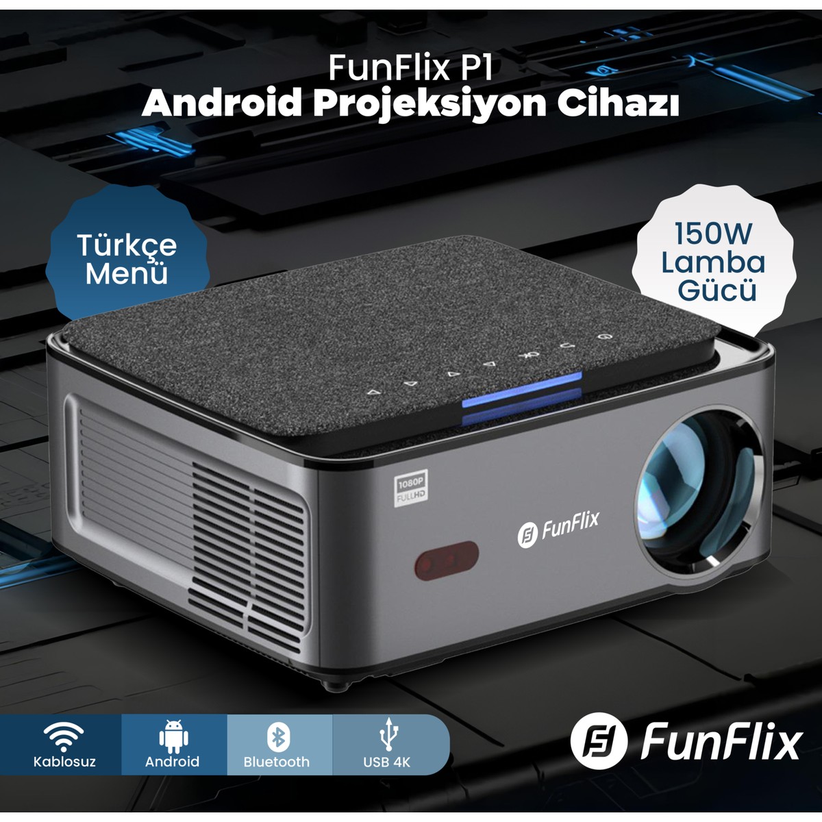 Funflix P1 Android 4K Destekli LED Full Hd Projeksiyon Cihazı, Bluetooth, 150W Lamba, 300 Inç Görüntü