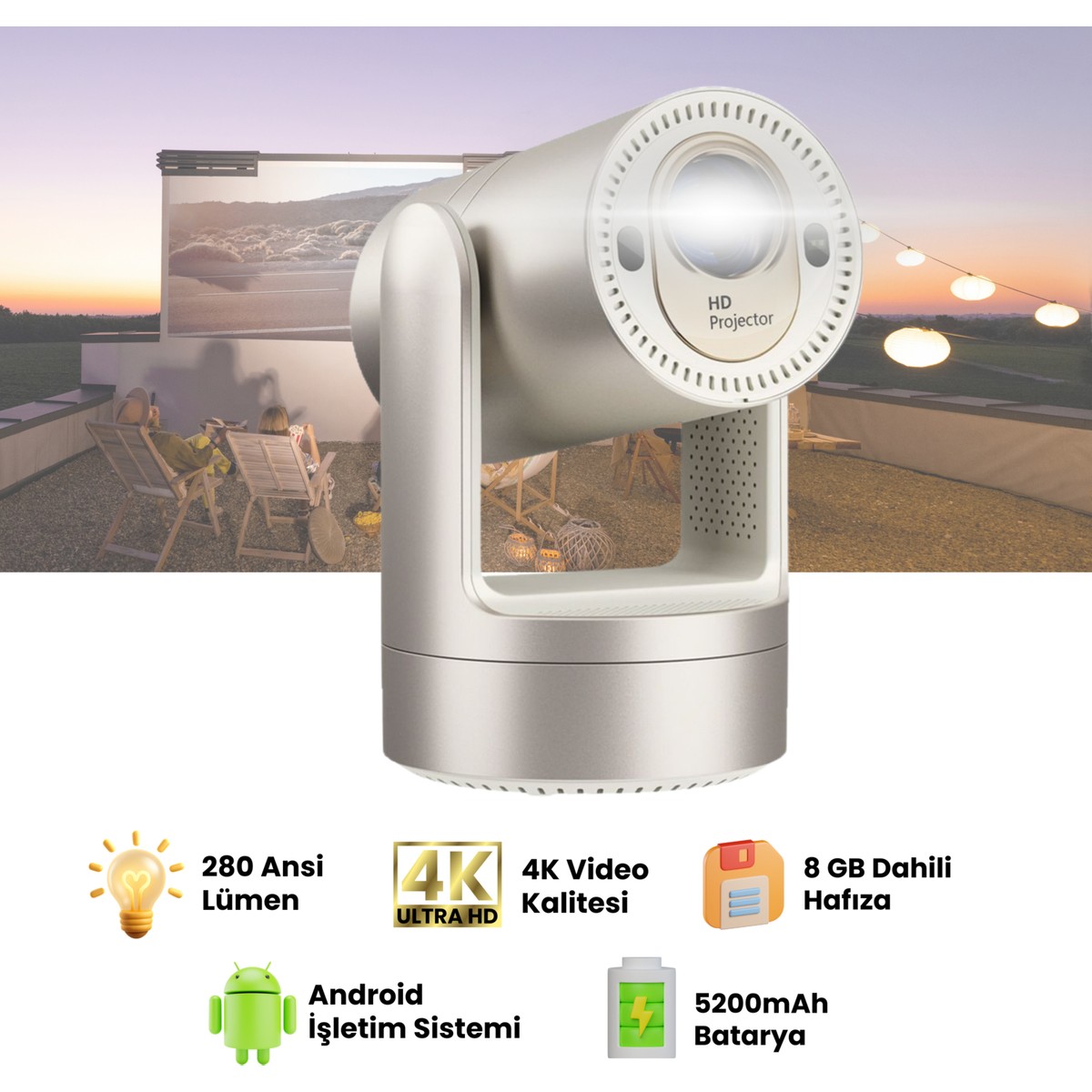Apollon Hy7 Bataryalı Projeksiyon Cihazı Taşınabilir 4K Destekli 1080P Android Sistemli Projektör