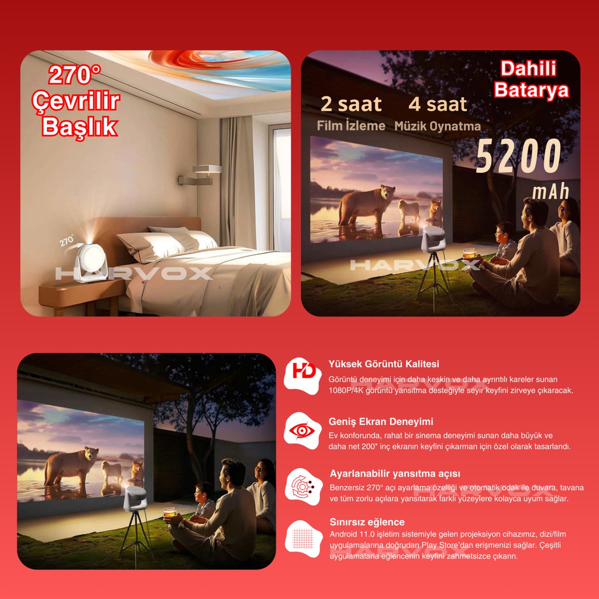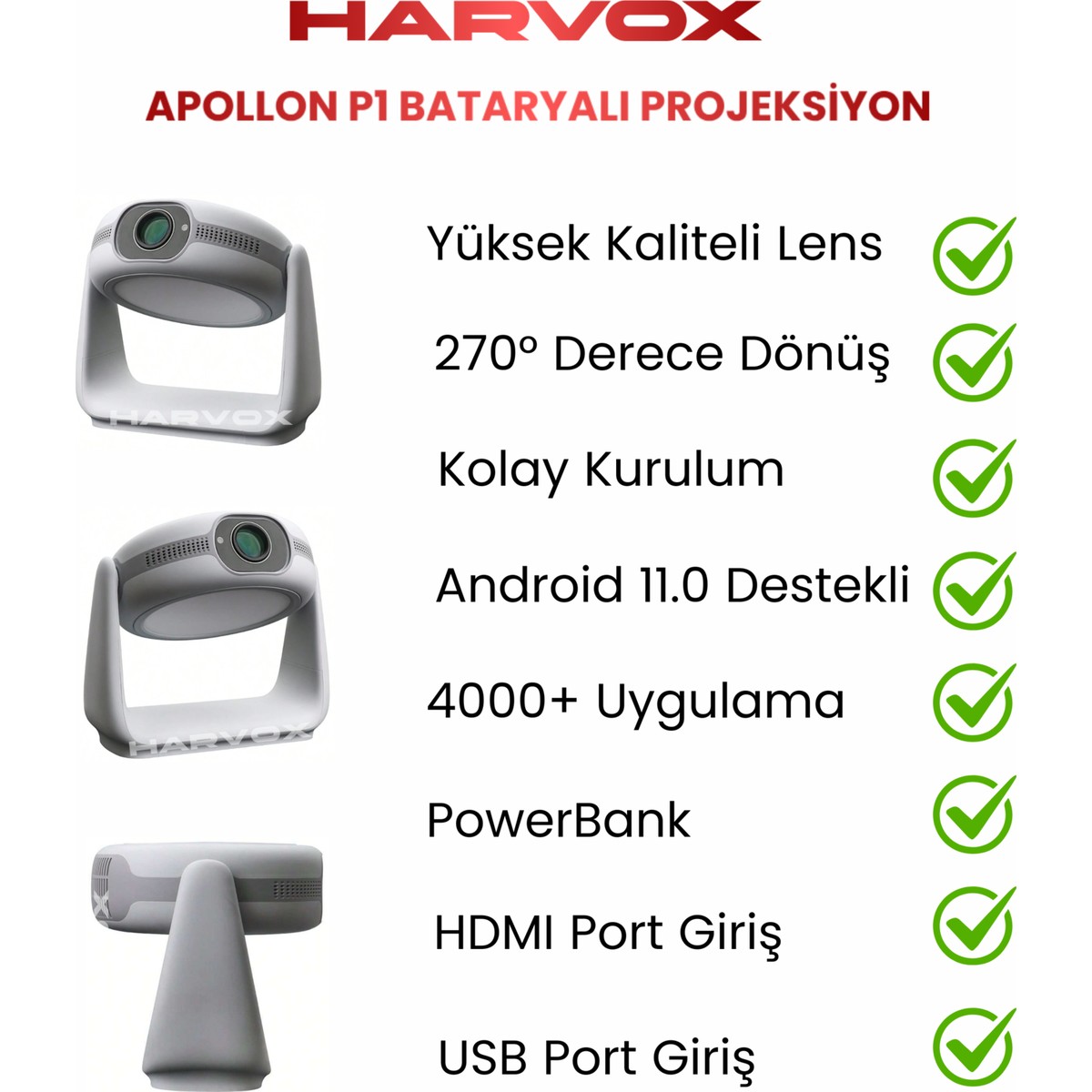 Harvox Apollon P1 Bataryalı Projeksiyon Cihazı Taşınabilir 4K Destekli 1080P Android Sistemli Projektör