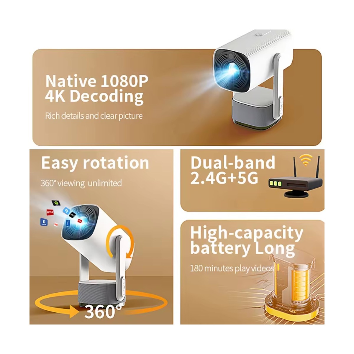 Dış mekan seyahat projektörü, 2 saat oynatma süresini destekleyen dahili şarj edilebilir bir pile sahiptir. Taşınabilir tasarımı sayesinde istediğiniz yere götürebilirsiniz, internet olmasa bile akıllı telefonunuzu projektöre bağlayarak film izleyebilirsiniz.