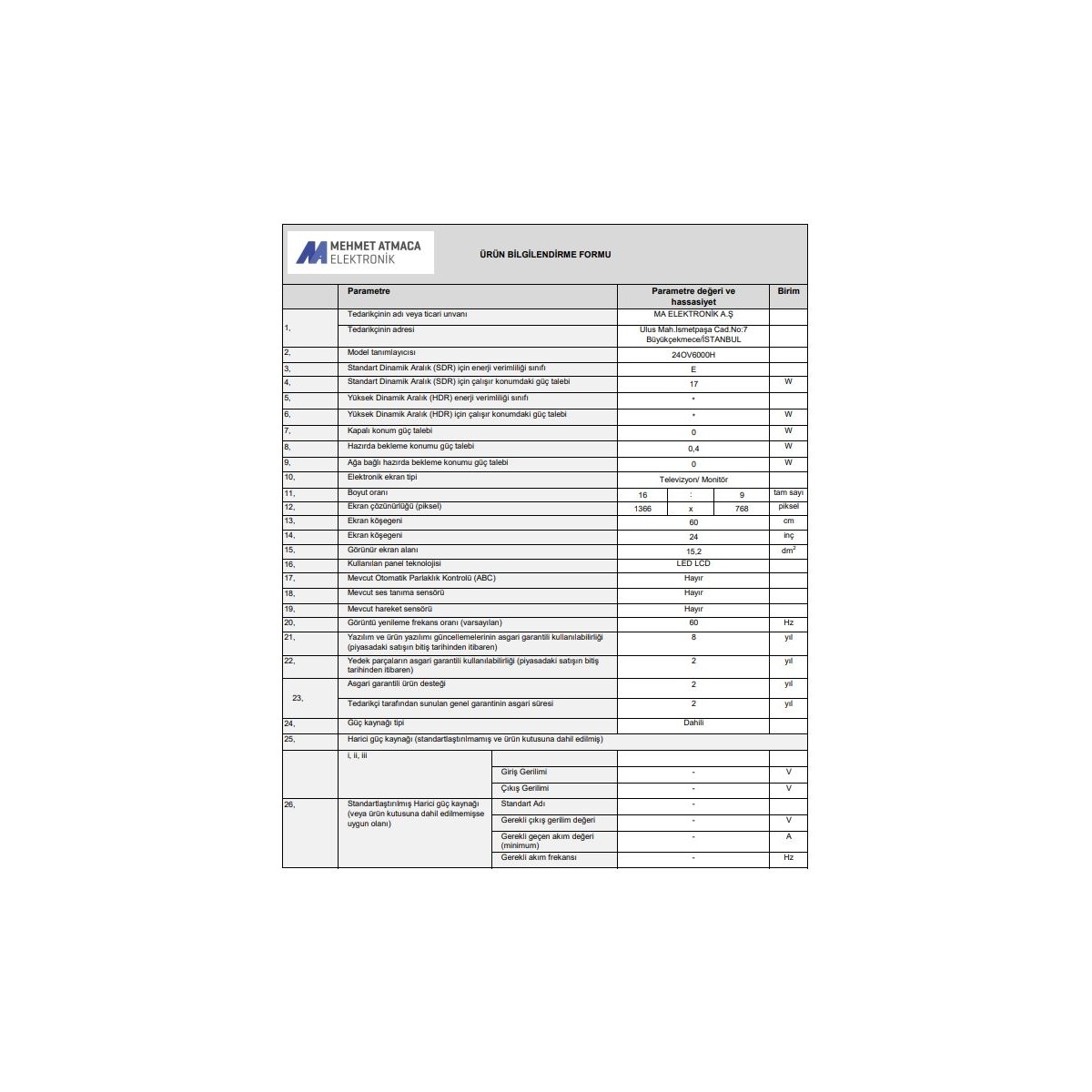 | Garanti Süresi (Ay) | |