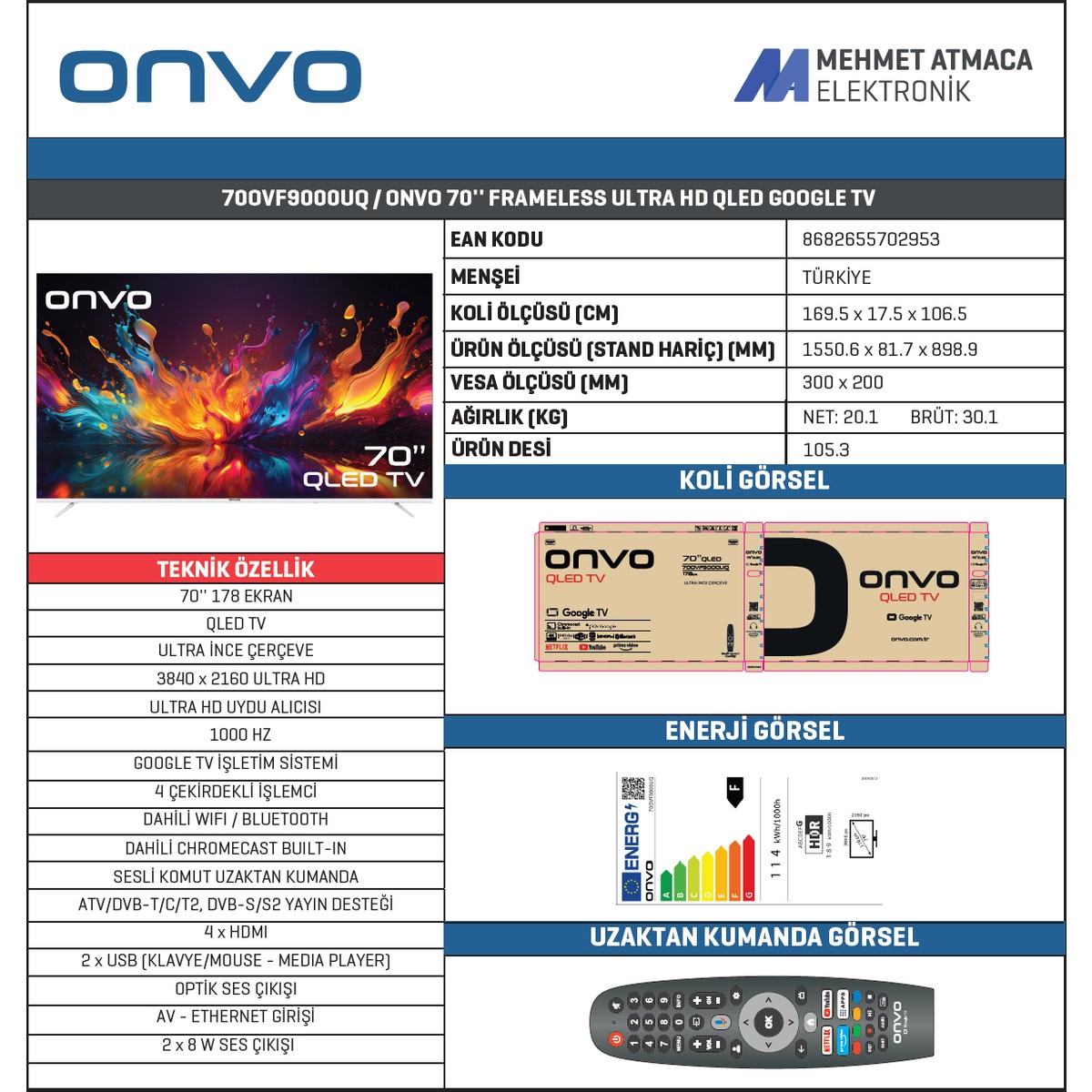 Onvo 70OVF9000UQ 70” 178 Ekran Uydu Alıcılı 4K Ultra HD QLED Google Smart TV