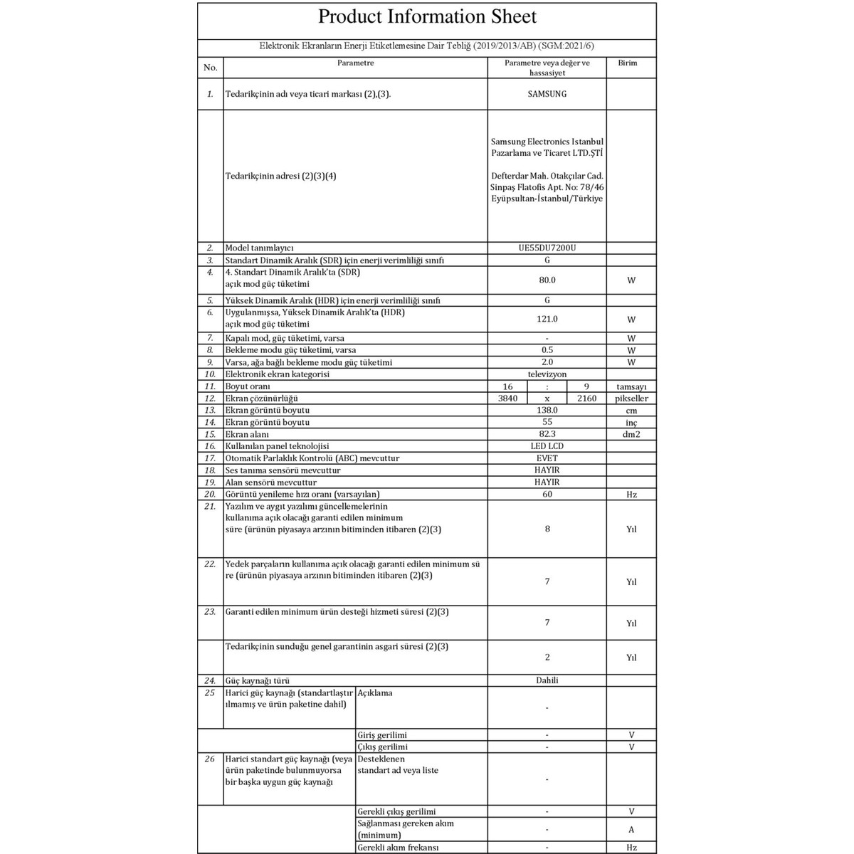 Samsung 55DU7200 55″ 139 Ekran Uydu Alıcılı Crystal 4K Ultra HD Smart LED TV için 45 değerlendirme