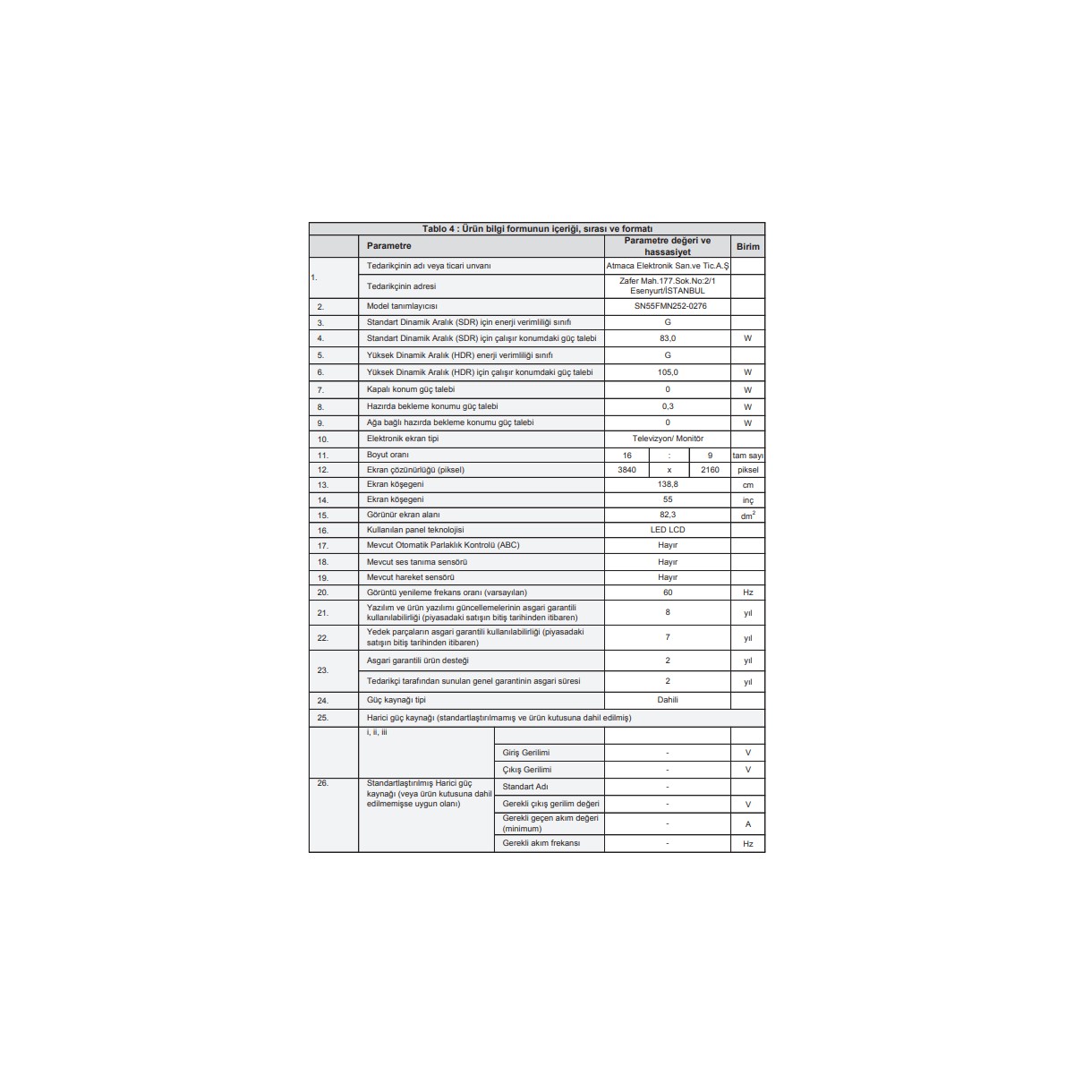 • Enerji sınıfı: G (HDR modu) olup, 55 inç UHD sınıfındaki modeller arasında ortalama enerji tüketimine sahiptir (yaklaşık 70 kWh/1000 saat).