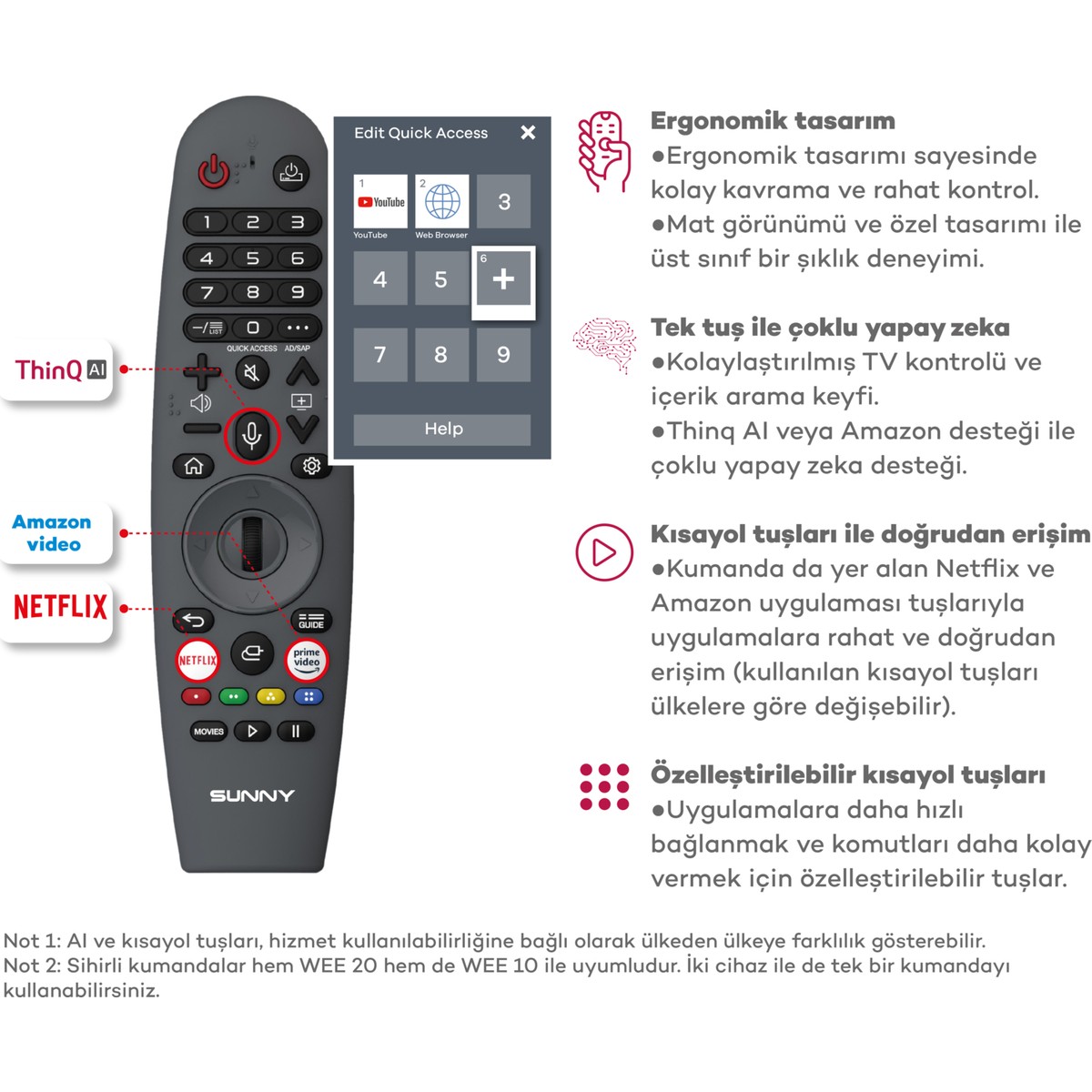 • webOS 2.0, Türkçe sesli komut, yapay zekâ destekli öneri sistemi ve kolay erişim sunan webOS Hub 2.0 ana ekran yapısıyla kullanıcı deneyimini zenginleştirir.